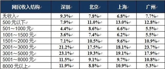 《報告》顯示,和其他城市比較,深圳網(wǎng)民中學(xué)生比例相對較少,只有15.3%;而企業(yè)員工、專業(yè)技術(shù)人員、產(chǎn)業(yè)服務(wù)業(yè)工人占比偏多。網(wǎng)民月收入水平相對較高。在對北京、上海、廣州、深圳4城網(wǎng)民收入調(diào)查中,深圳網(wǎng)民不單年輕,而且“多金”,以月收入2000-5000元的居多(見附表),正是熱衷網(wǎng)購且購買力最強(qiáng)的消費人群。